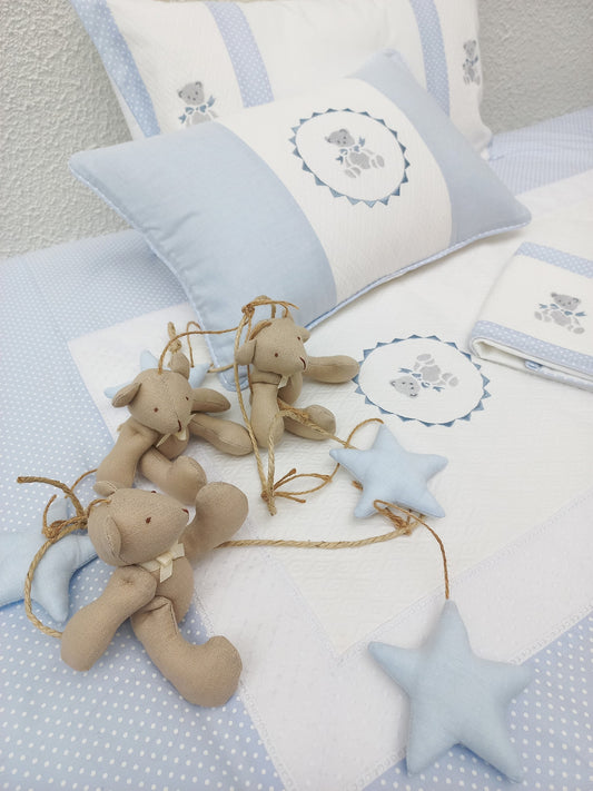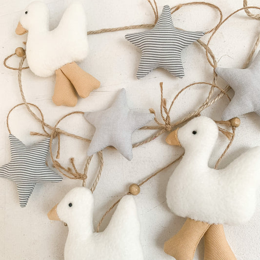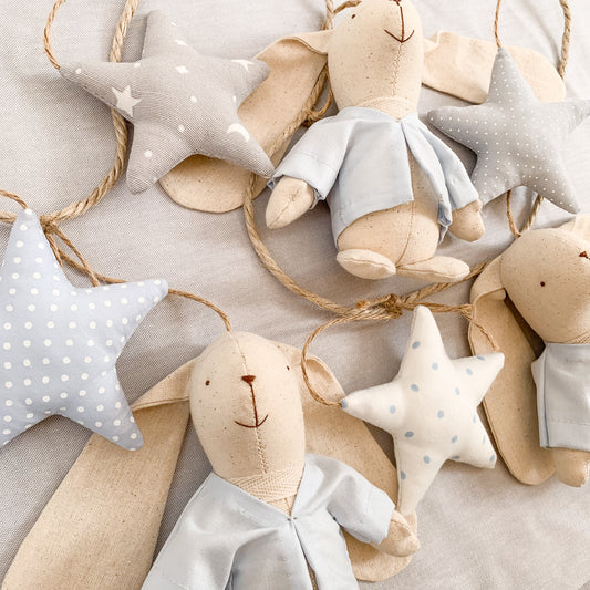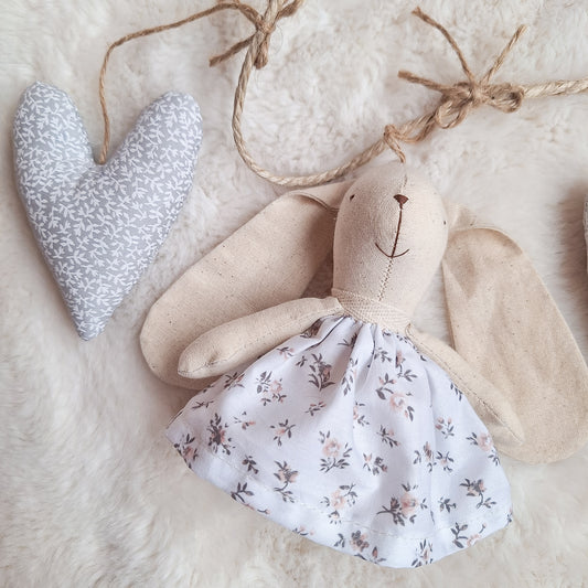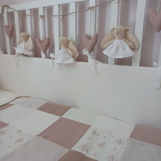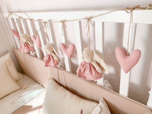 Guirnalda conejas - florcitas gris y rosa y hojitas gris