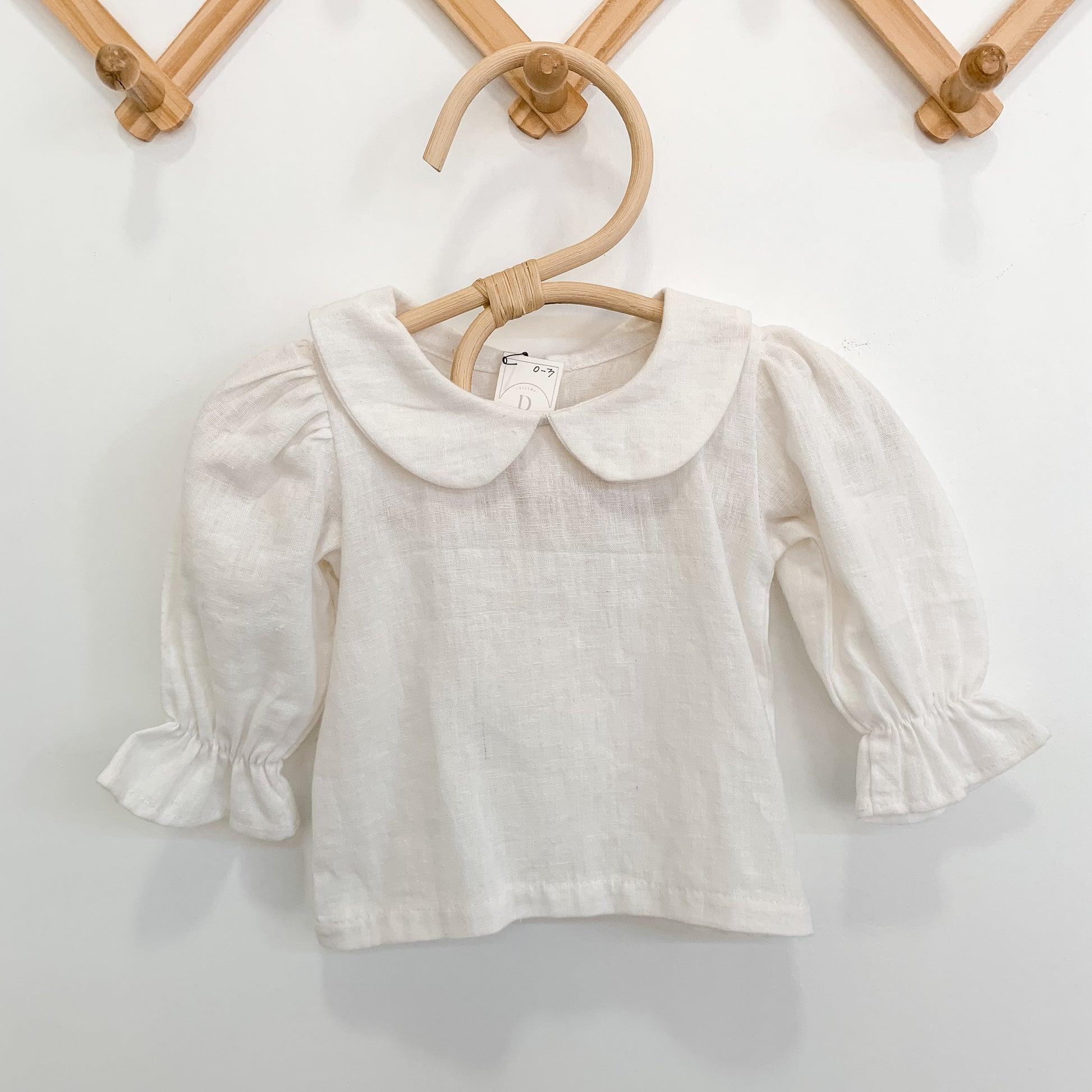 Blusa cuello bebe, manga elasticada y botones en la espalda.
