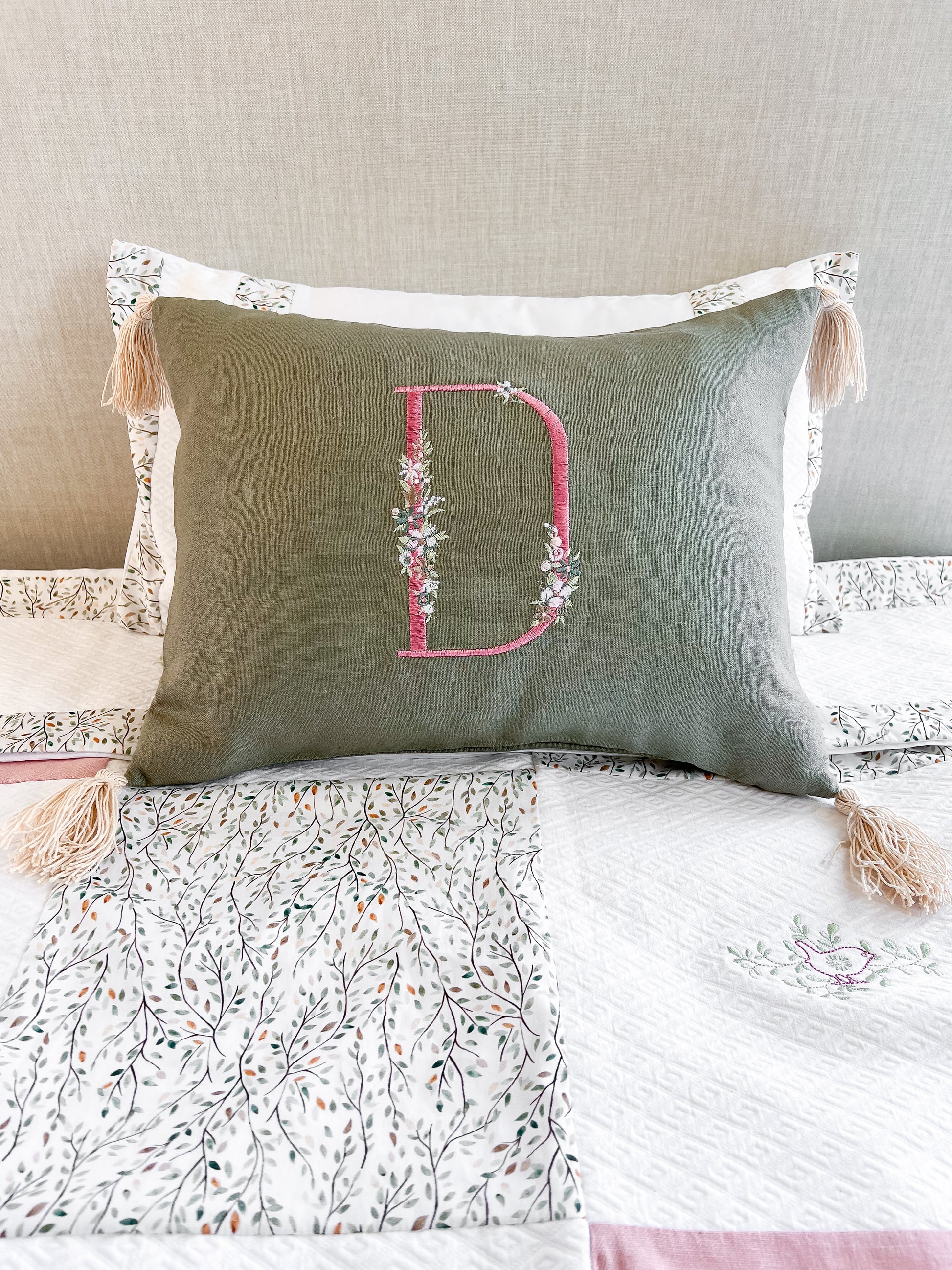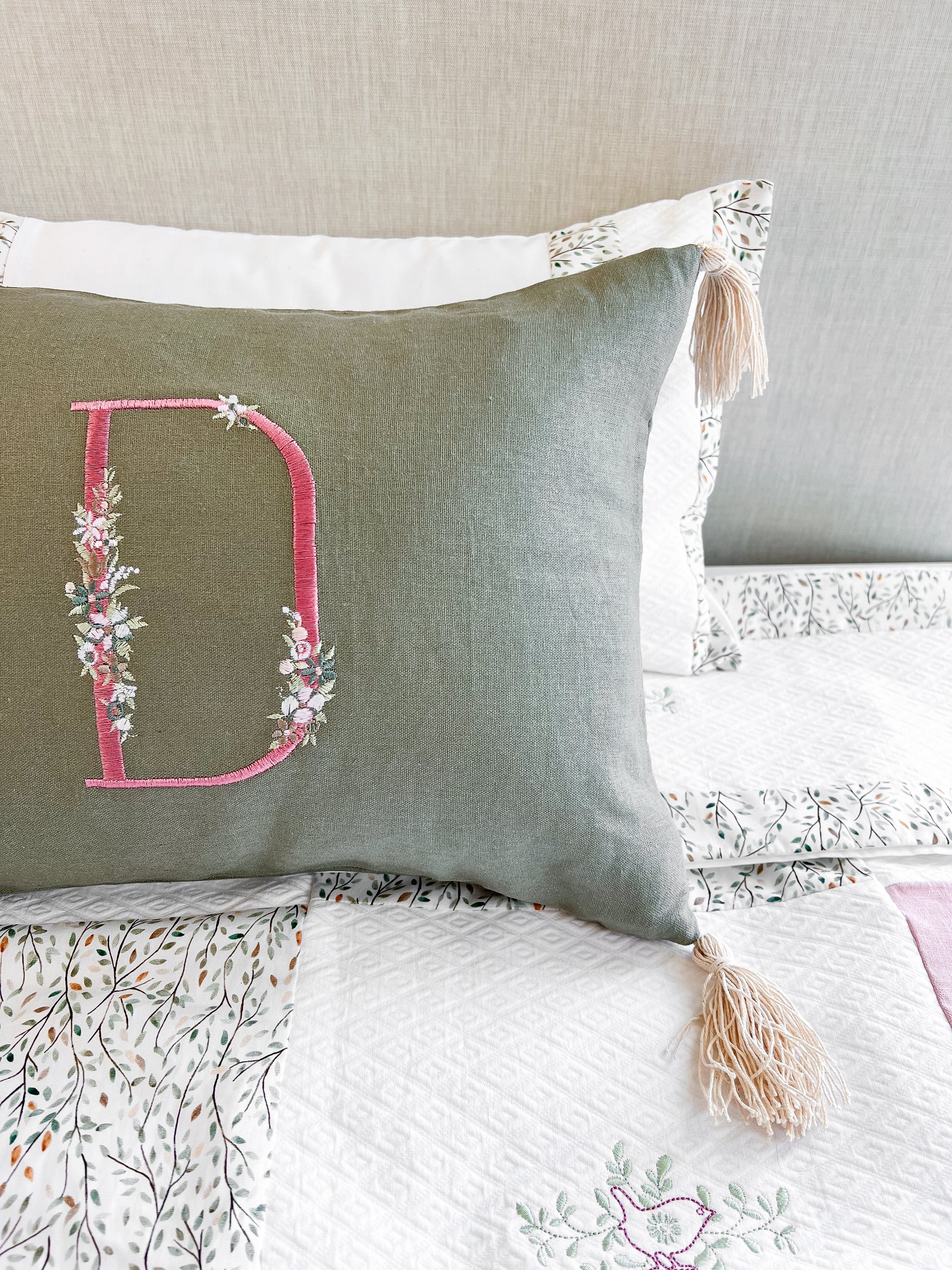 Cojín largo con borlas al rededor en tela a elección. Puedes pedir modificaciones en las telas y tonos para que quede a juego con tu decoración. PUEDES PEDIRLO CON O SIN LAS FLORES BORDADAS, ES DECIR, SÓLO LA LETRA. TENEMOS MÁS TELAS DISPONIBLES. Ponte en contacto y te las mostramos!!.