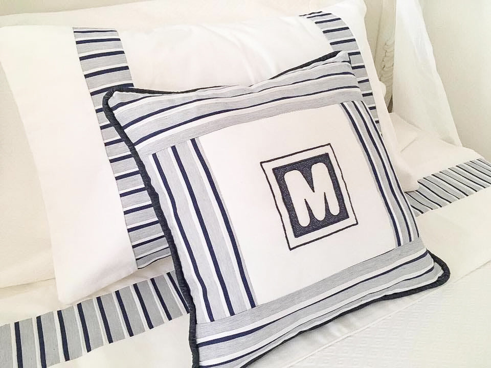 Cojín personalizado con bordado a elección. Puedes pedir modificaciones en las telas y tonos para que quede a juego con tu decoración.
