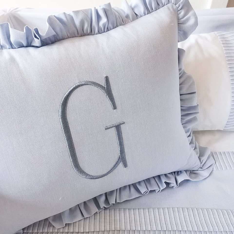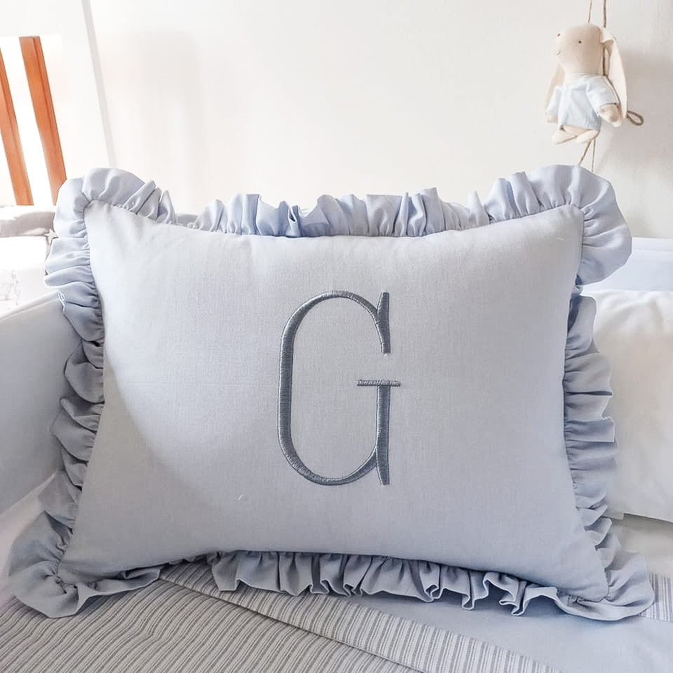 Cojín largo con vuelos al rededor en tela a elección. Puedes pedir modificaciones en las telas y tonos para que quede a juego con tu decoración. PUEDES PEDIRLO CON O SIN LAS FLORES BORDADAS, ES DECIR, SÓLO LA LETRA.