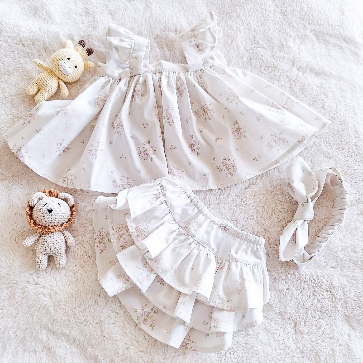 Conjunto de blusa con vuelos y lazo en espalda, más cubre pañal con vuelos en la parte de atrás y delantero.