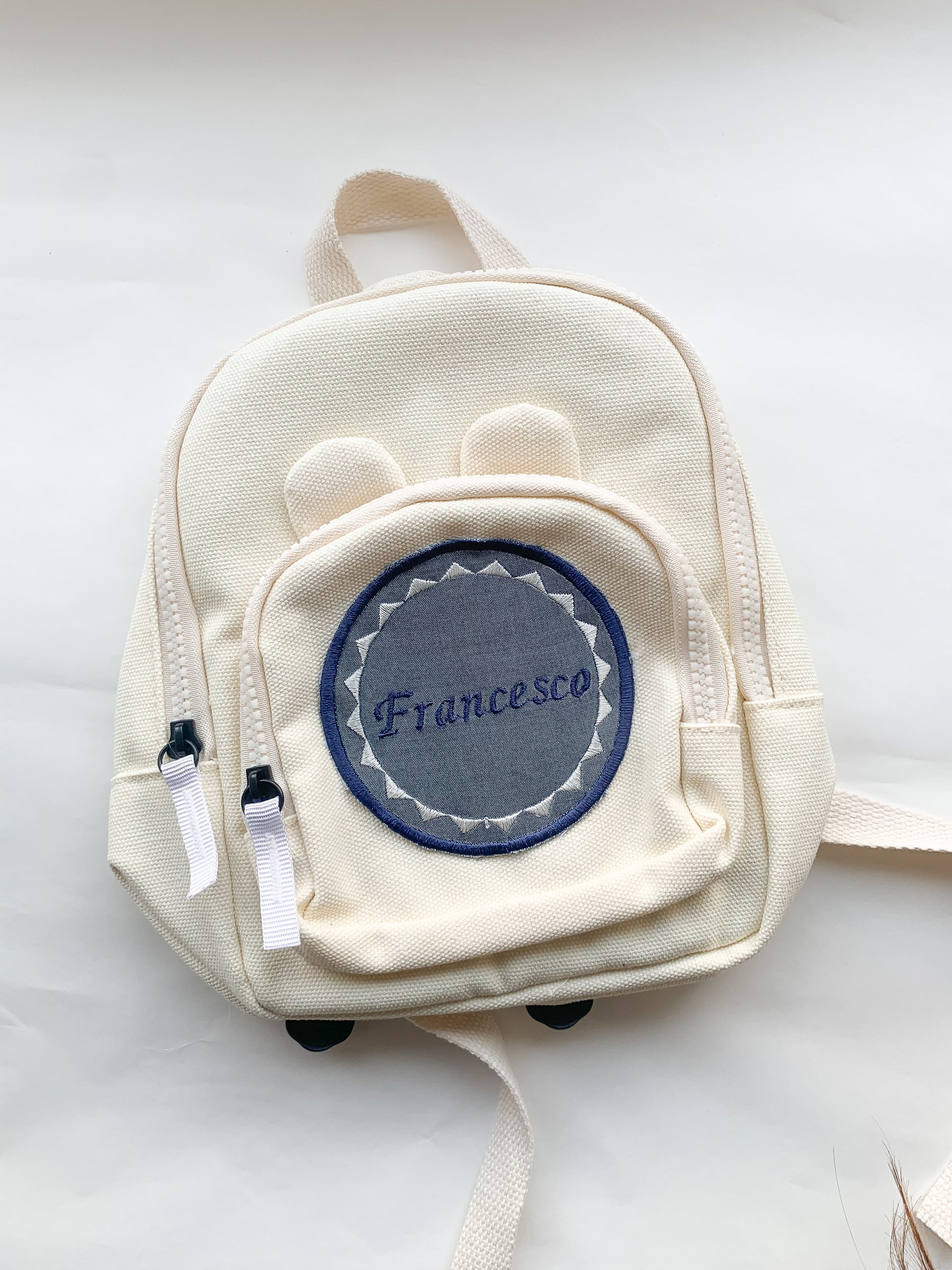 Mochila para muda, colación y lo que quieras, con su nombre bordado en medallón con tela a elección. Te recomendaremos que sea de las mismas telas del delantal para que hagan juego.