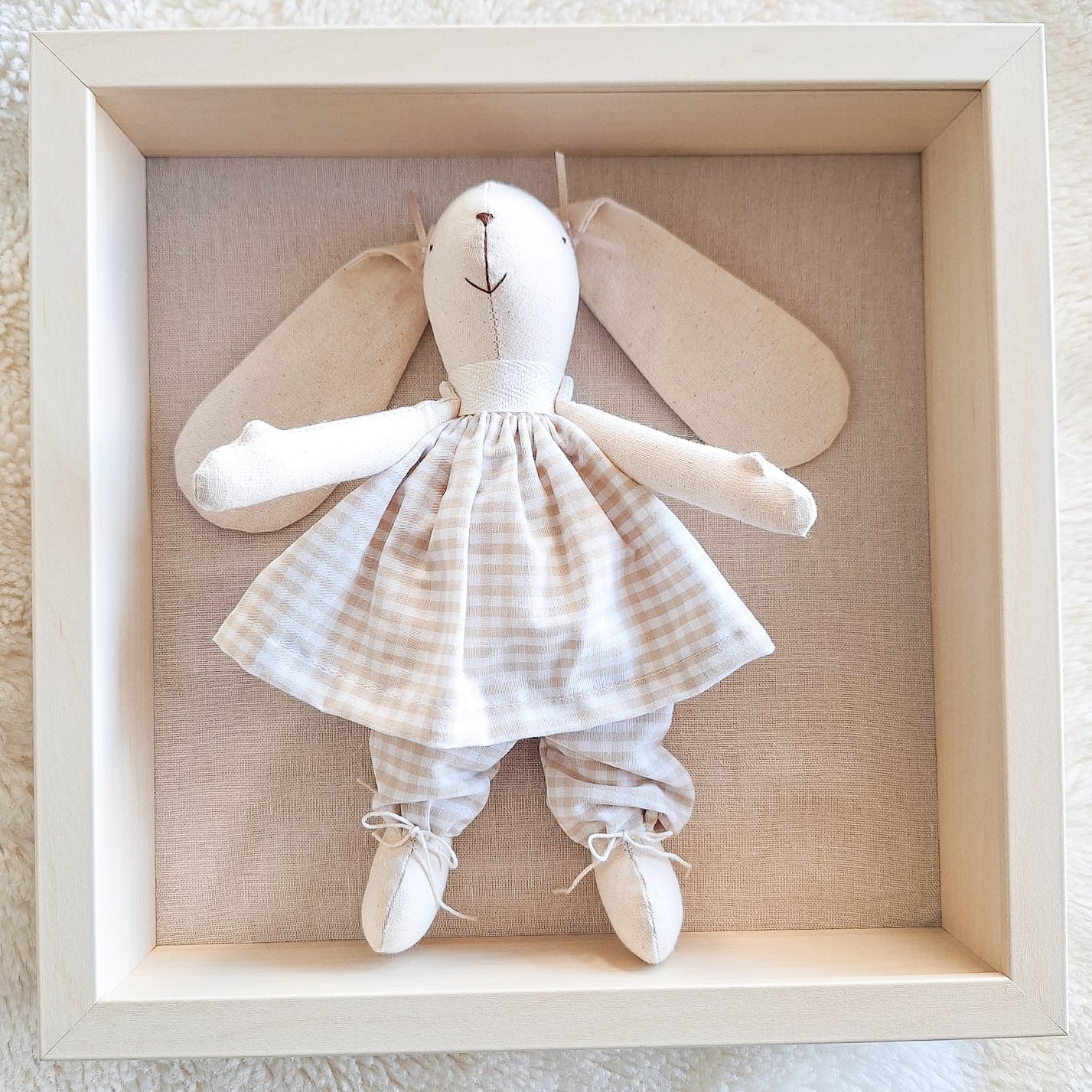Cuadrito de madera lacada blanca 28x28cm aprox. telas de algodón / lino, muñecos con relleno hipoalergénico.