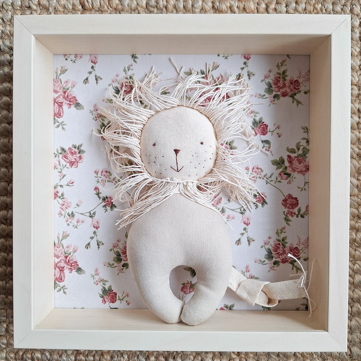 Cuadrito de madera 28x28cm aprox. Originales hechos a mano en nuestro taller, telas de algodón / lino, muñecos con relleno hipoalergénico.