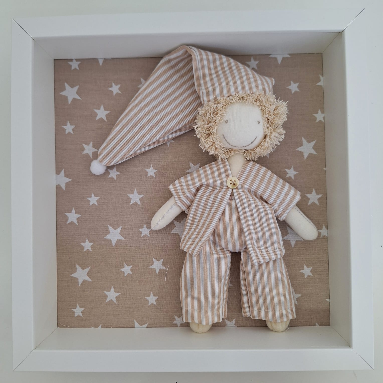 Cuadrito de madera lacada blanca 28x28cm aprox. telas de algodón / lino, muñecos con relleno hipoalergénico.