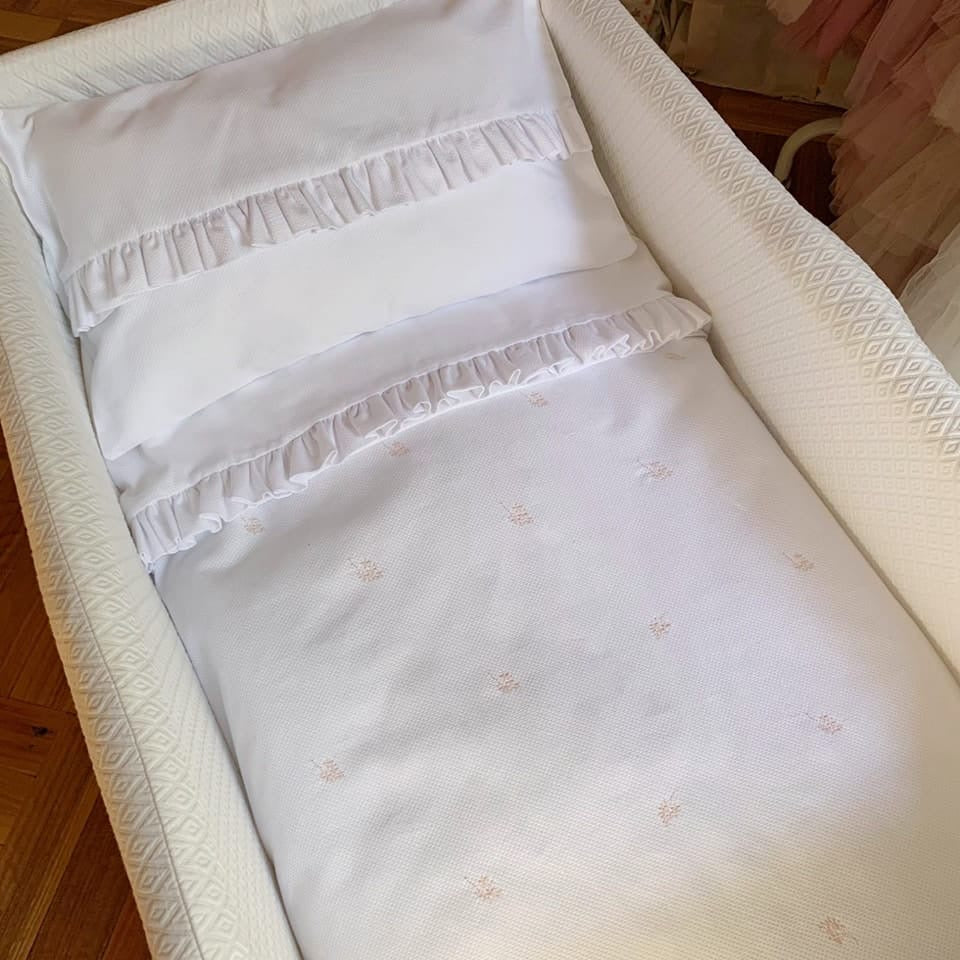 Cubrecama en patchwork con bordado. Con relleno de napa, acolchado.