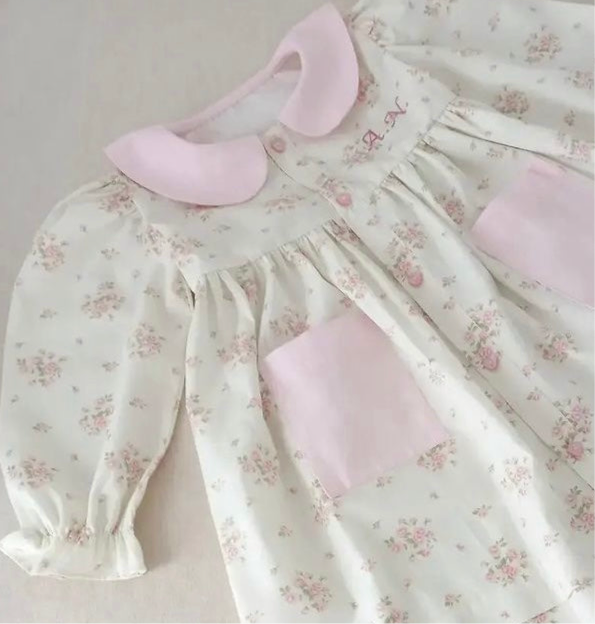 Delantal para el Jardín en telas 100% algodón. Incluye bordado de nombre o iniciales, según tu preferencia. Con cuello bebé, cintura recogida, bolsillos funcionales cuadrados o forma corazón y detalles en puños.