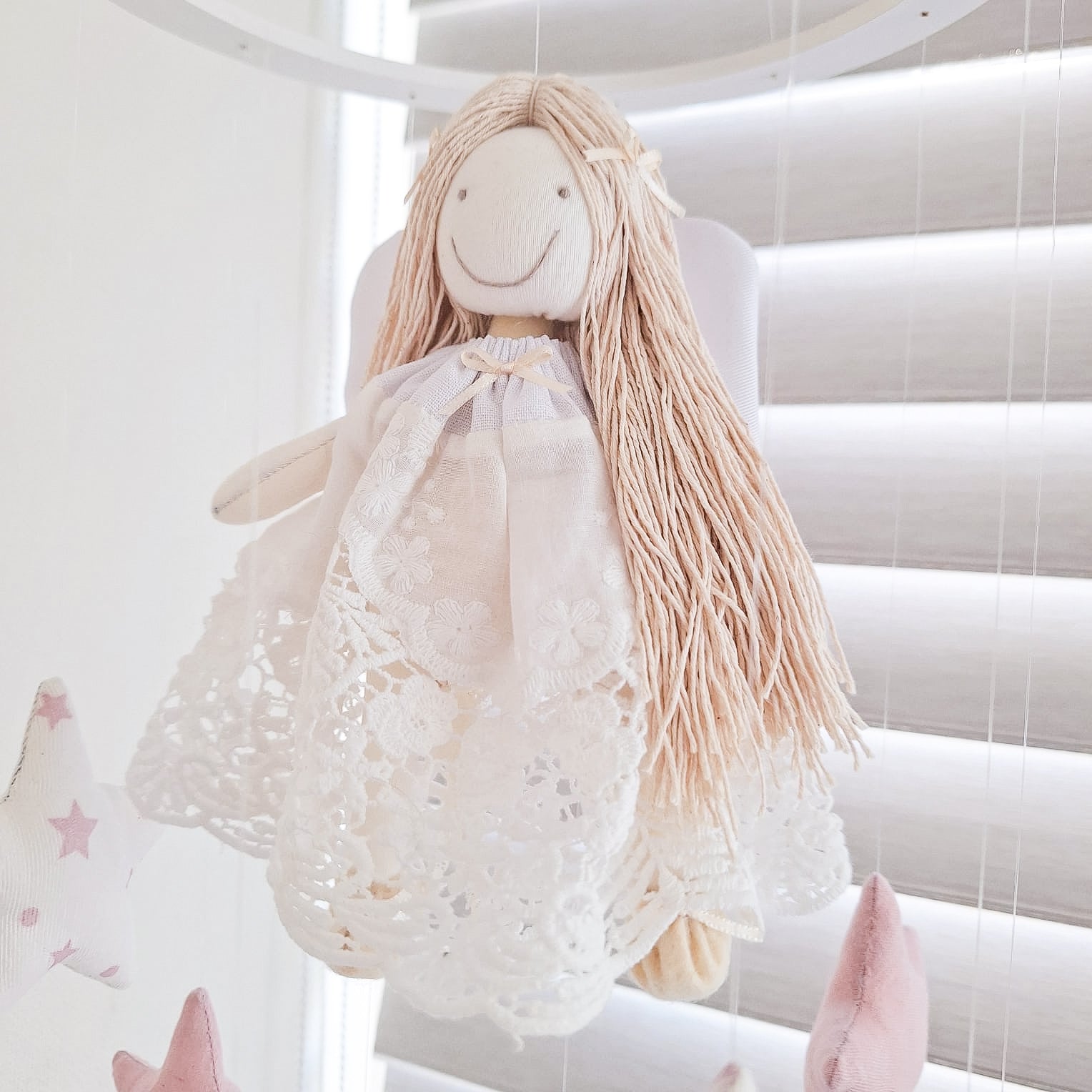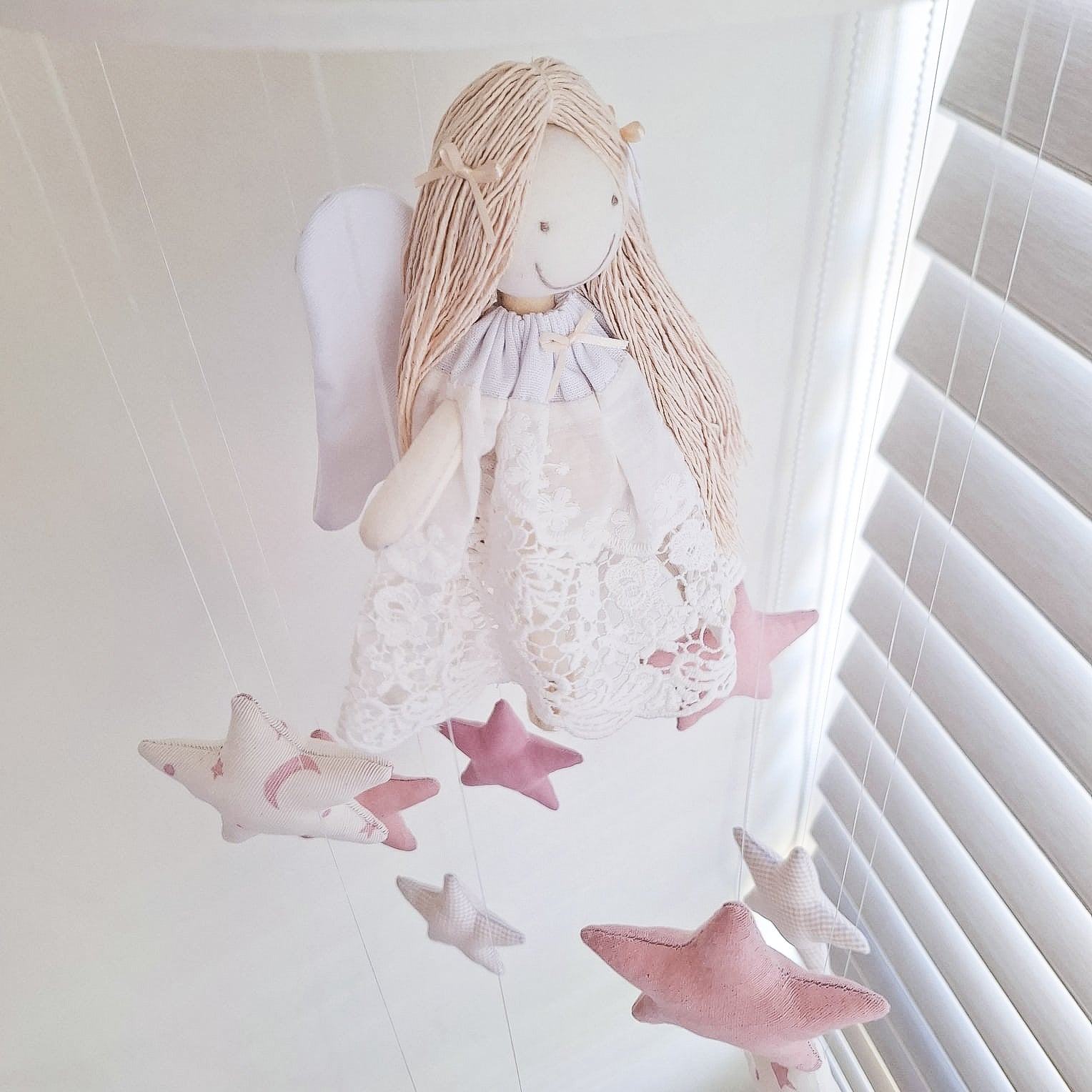 Móvil con angelita y estrellas, en telas 100% algodón relleno hipoalergénico.
