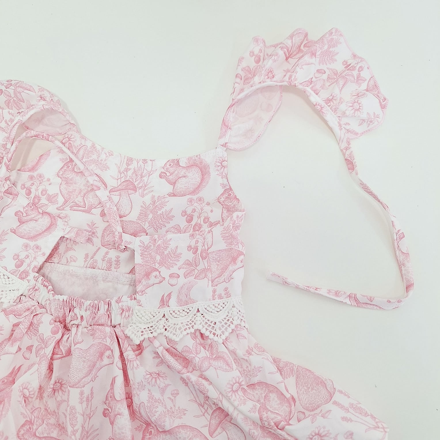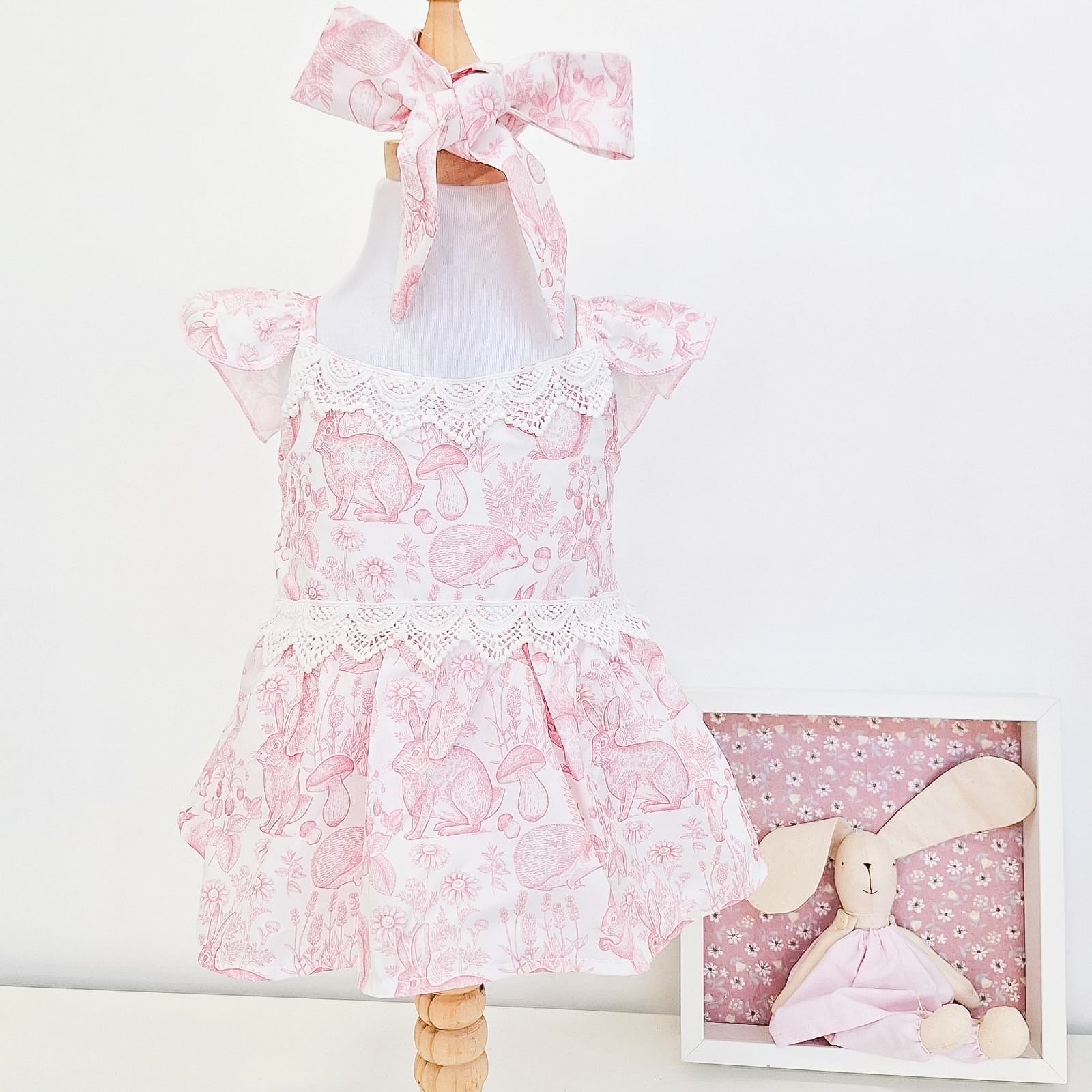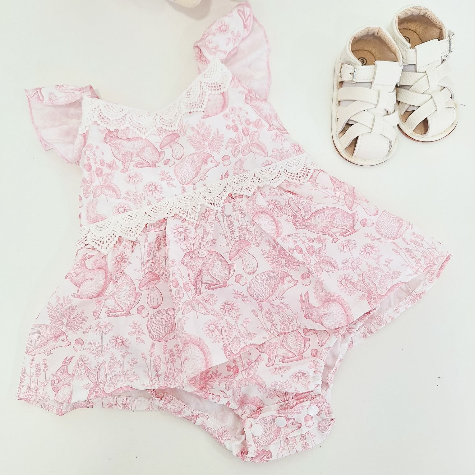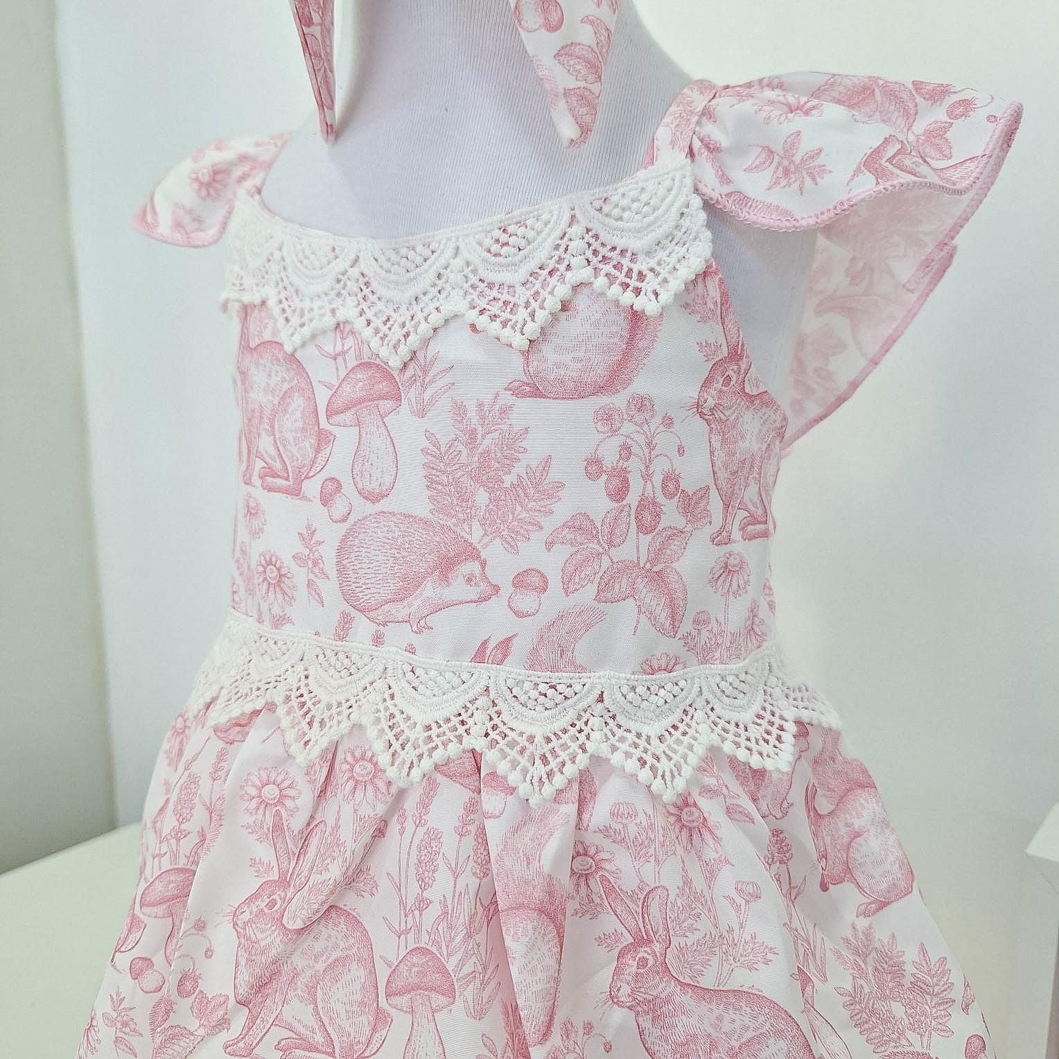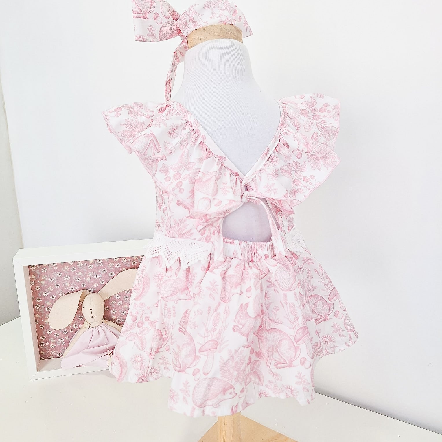 Ranita tela estampada con conejitos y aplicación de bolillo. Tela ligera perfecta para verano