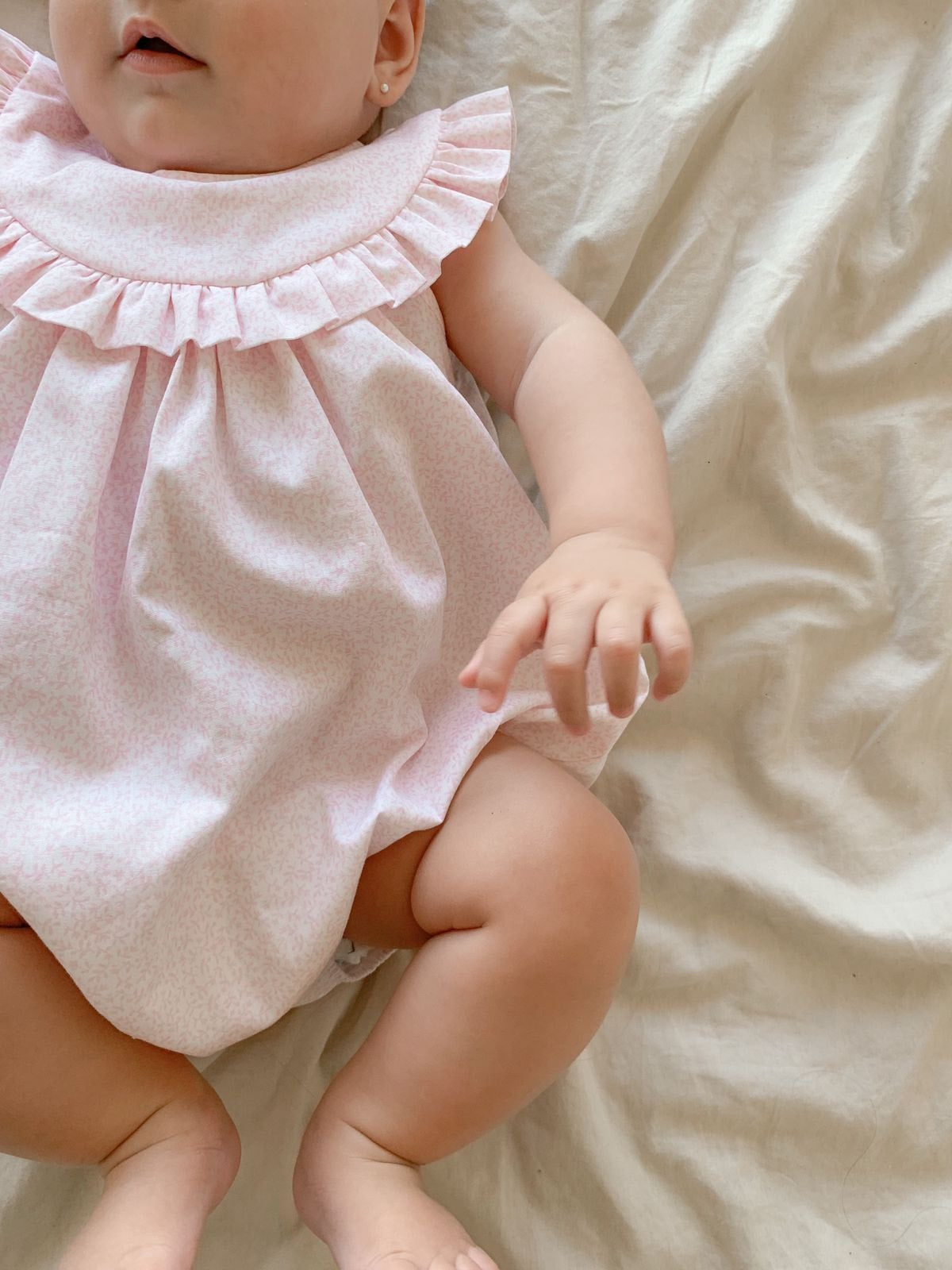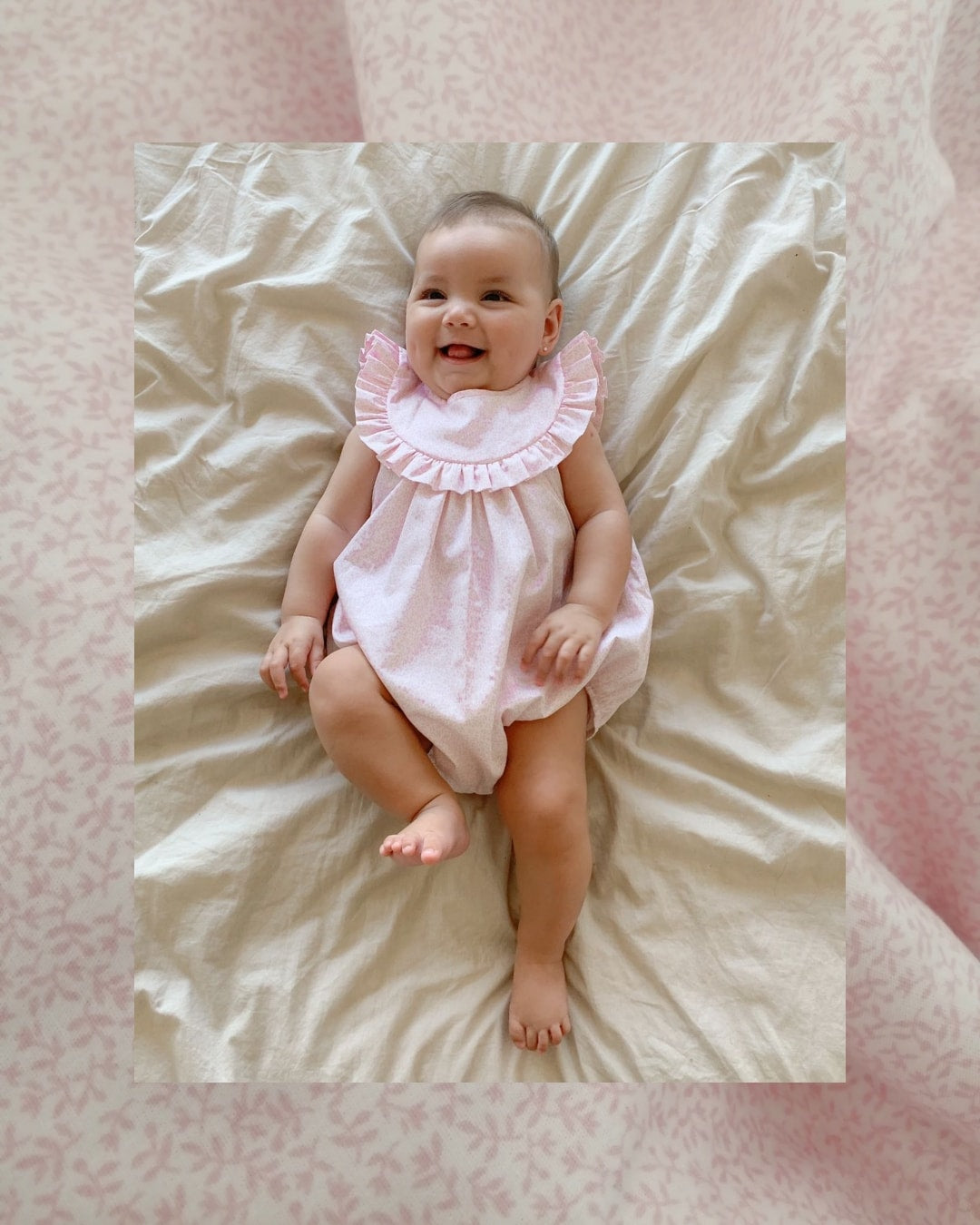 Ranita con vuelitos en tela estampada con hojitas y florcitas rosa