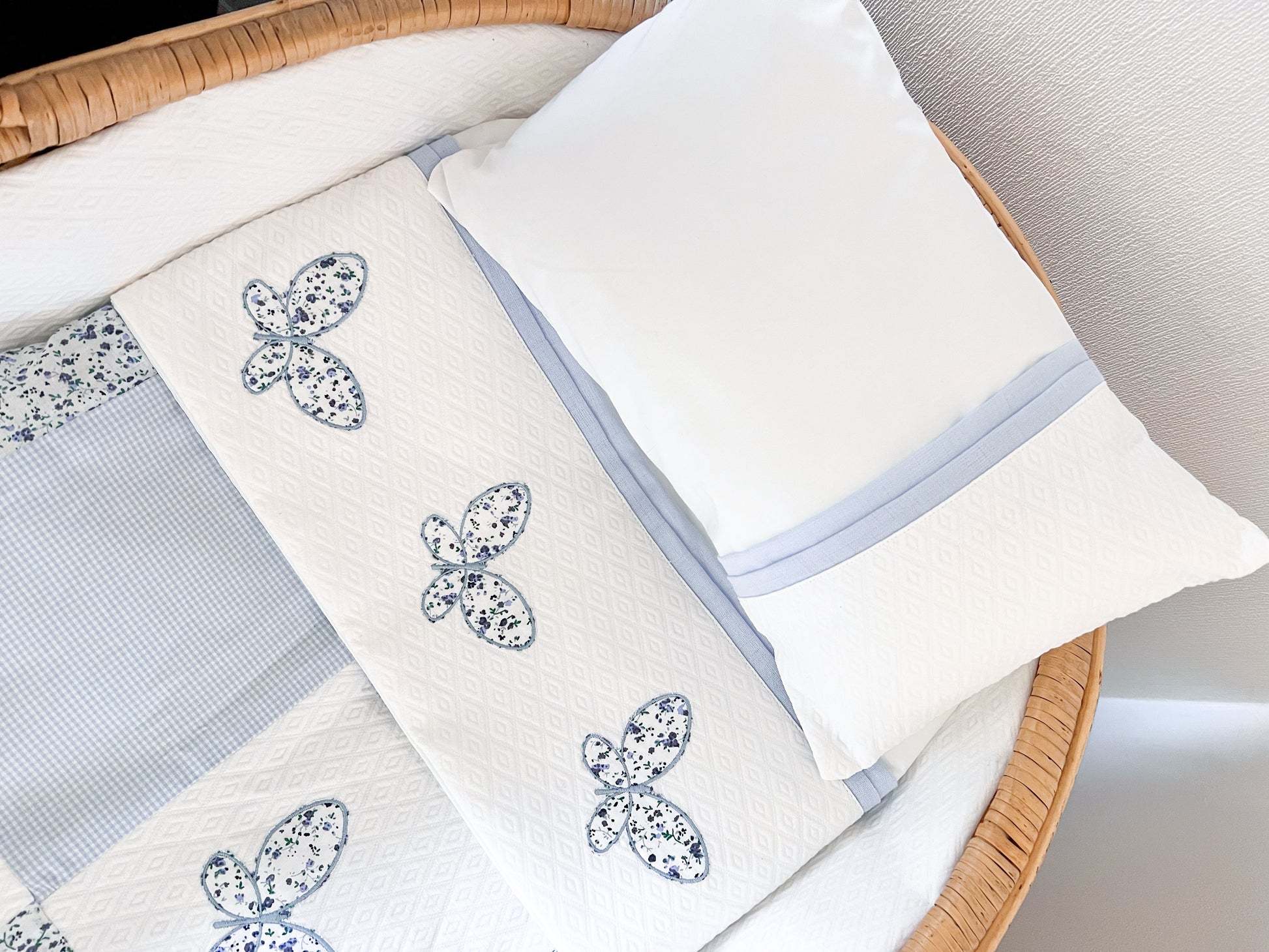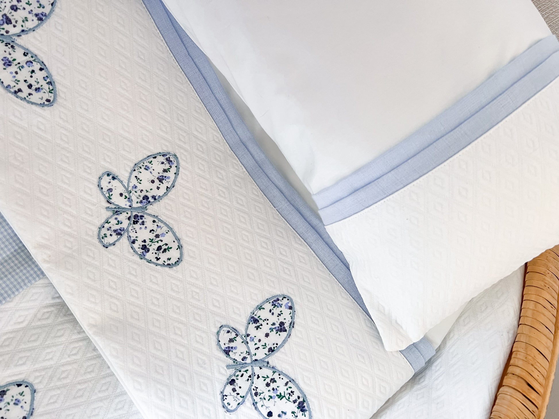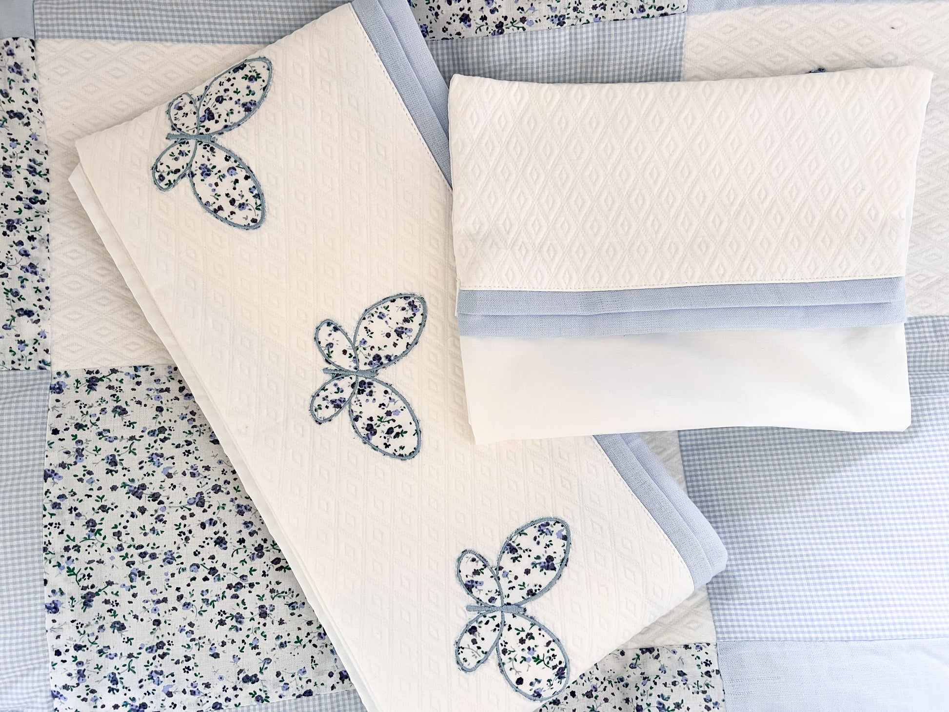 Sábanas para cuna con aplicación de tela y bordado. El set de sábanas incluye sábana bajera elasticada, sábana encimera con guarda bordada y funda* de almohada bordada.