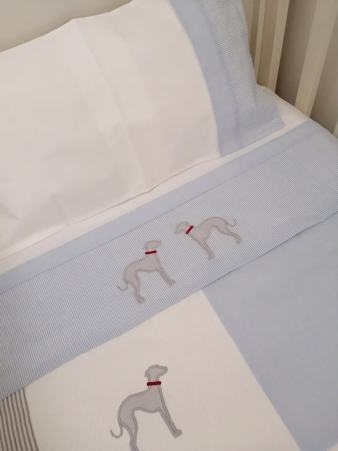 Sábanas para cuna con aplicación de tela y bordado. El set de sábanas incluye sábana bajera elasticada, sábana encimera con guarda bordada y funda* de almohada bordada.
