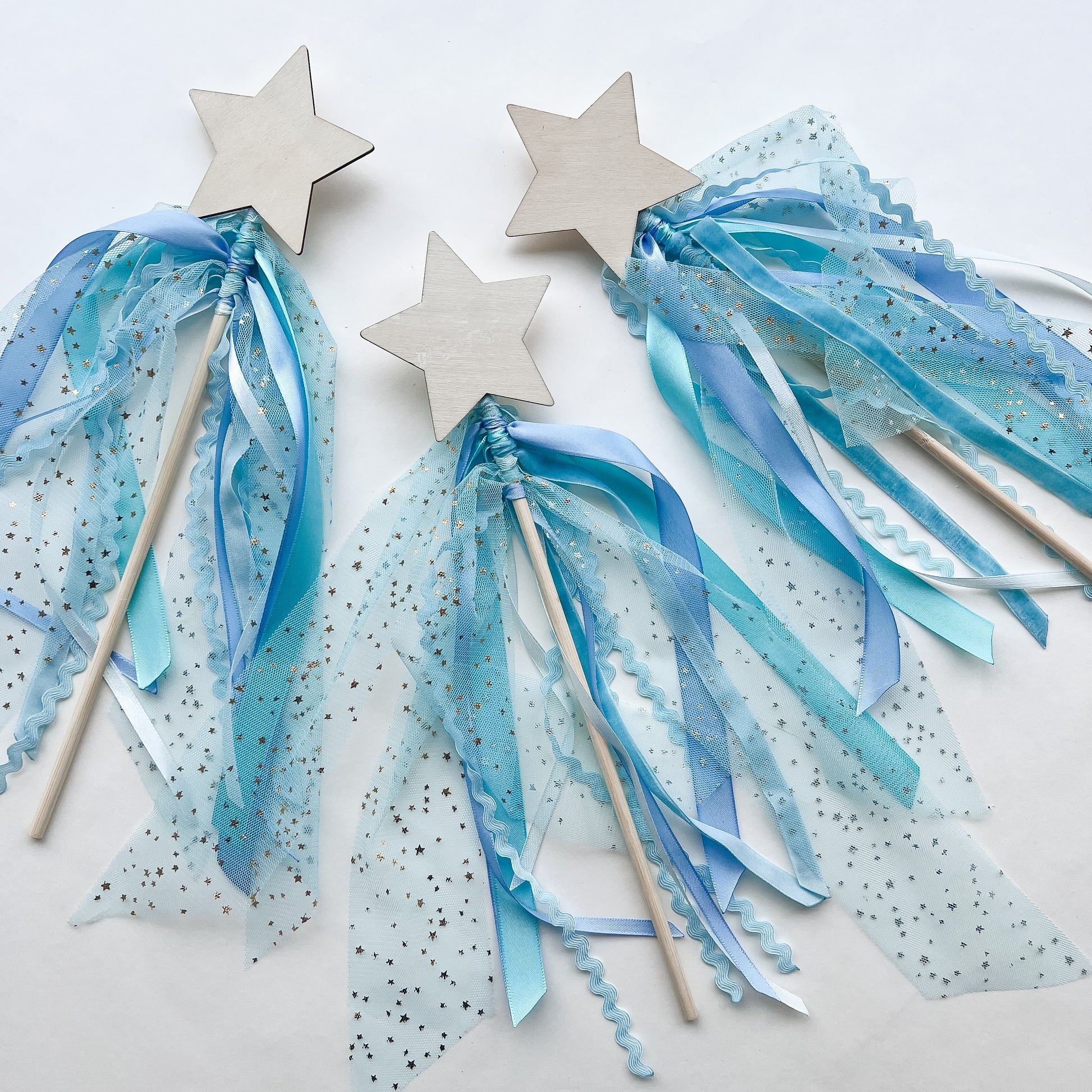 Varita mágica de madera, con aplicaciones en cintas de razo, terciopelo, etc.