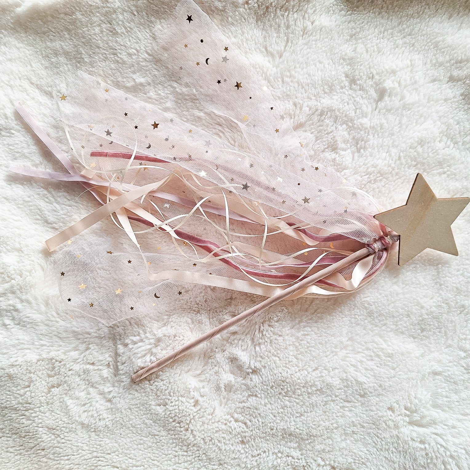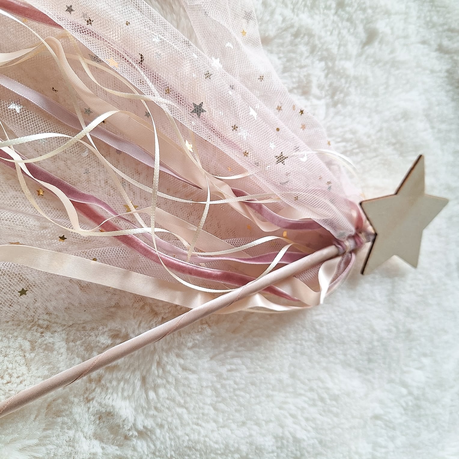 Varita mágica de madera, con aplicaciones en cintas de razo, encaje, terciopelo, etc.
