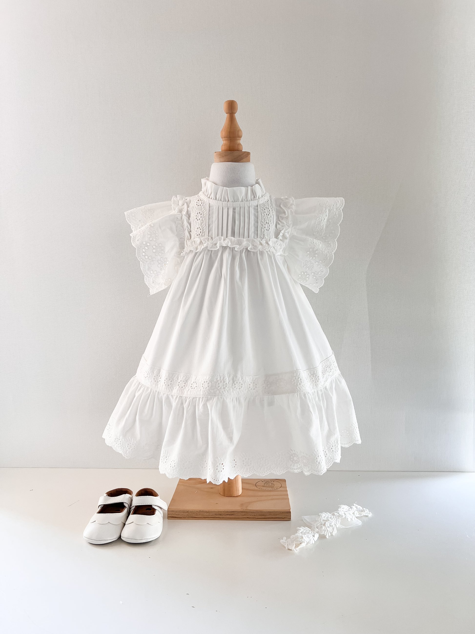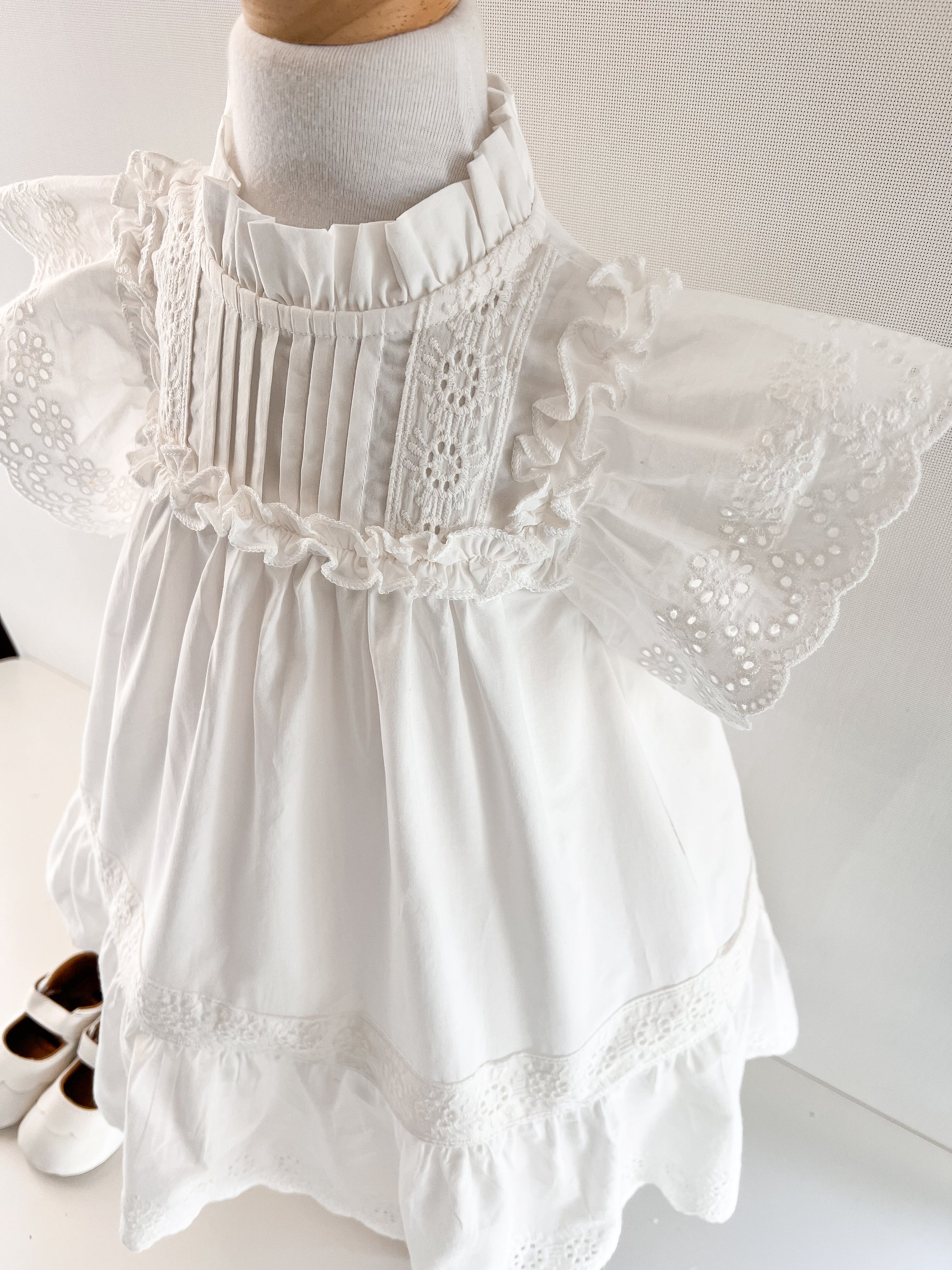 Vestido en algodón con alforzas en pecho, cintura recogida con aplicación de vuelitos, vuelitos en el cuello y broderie en ruedo y mangas.