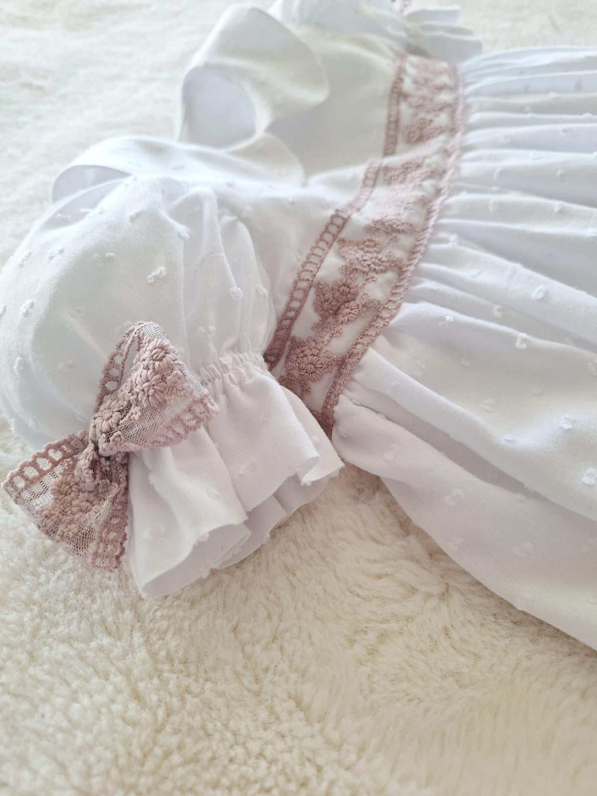 Vestido algodón plumetti blanco, manga globo, aplicación opcionaL en encaje color uva