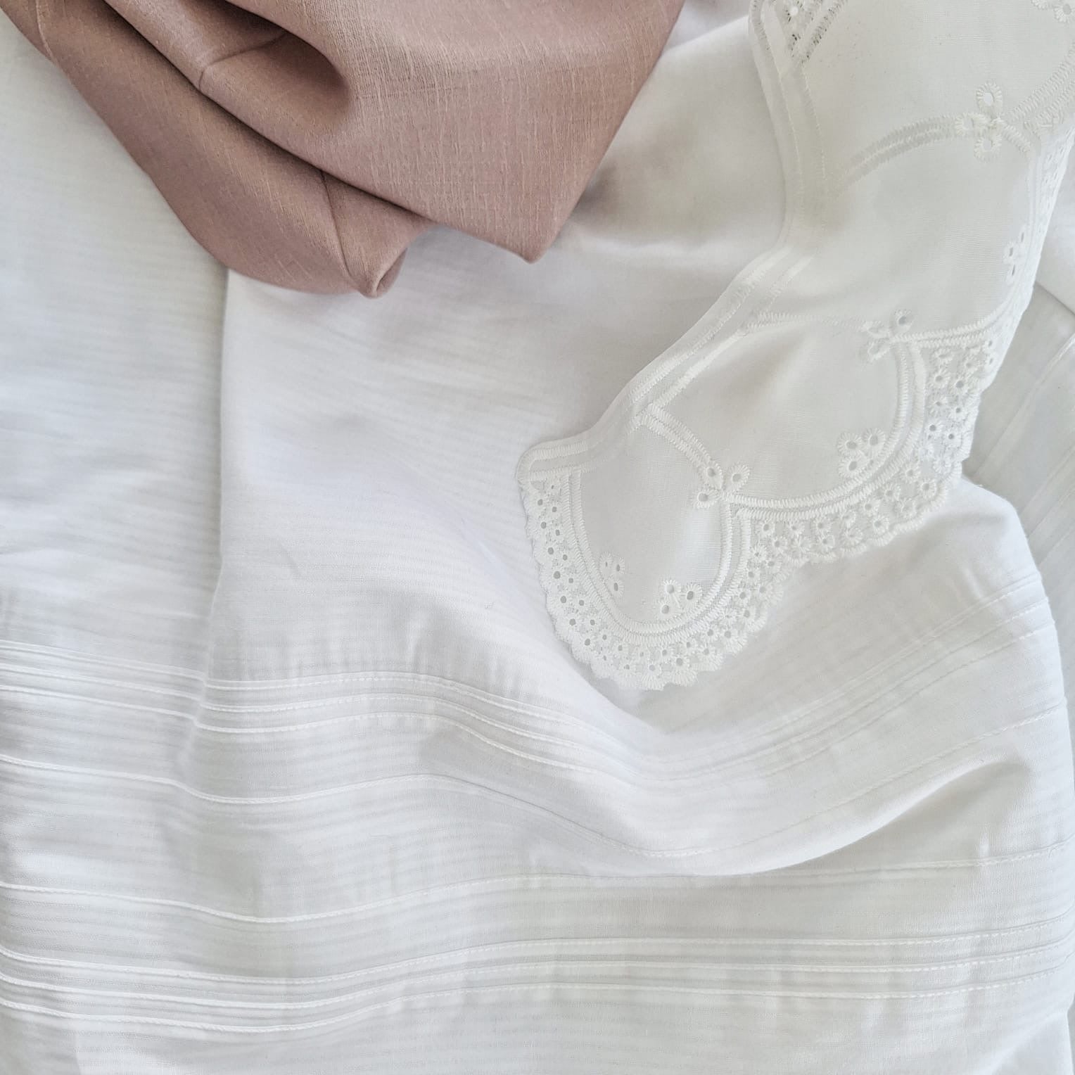 Vestido algodón o lino, manga globo corta o larga. Cuello bebé en broderie y lazo en palo rosa. La flor en el lazo es opcional y puedes cambiar el color del lazo.