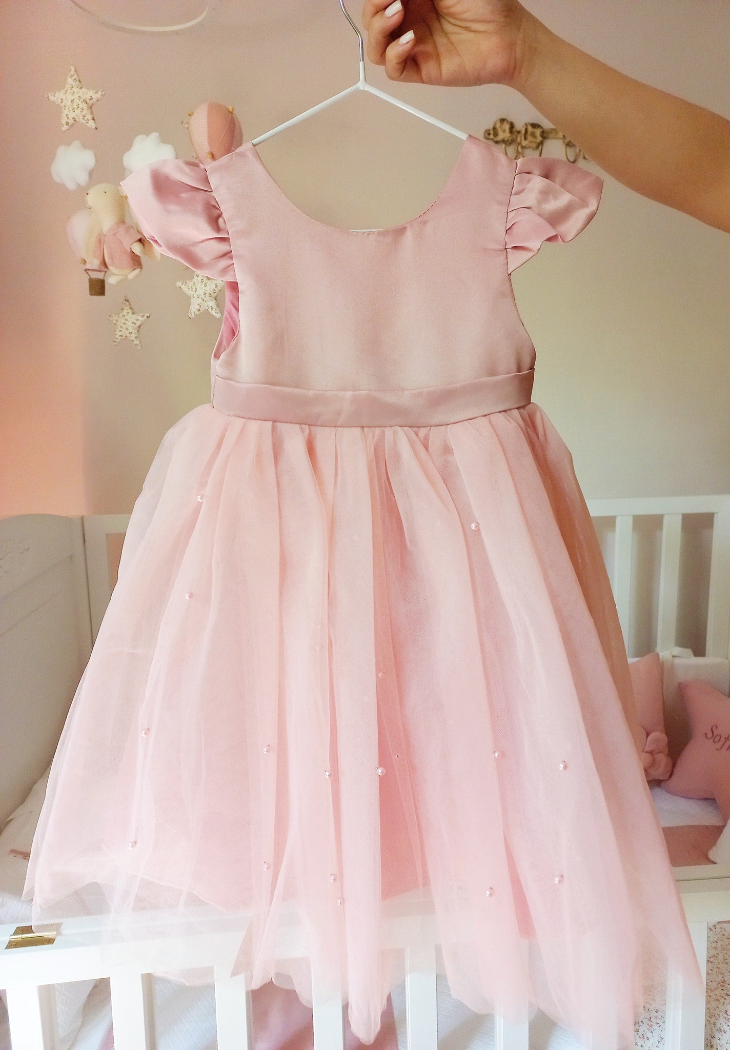 Vestido de razo rosa, con falda en suave tul con perlitas a todo bordadas. Vuelos en mangas y listón en la espalda.